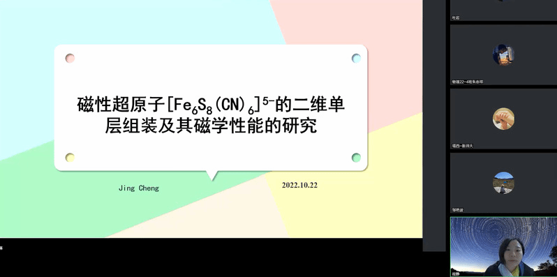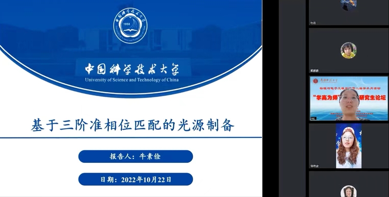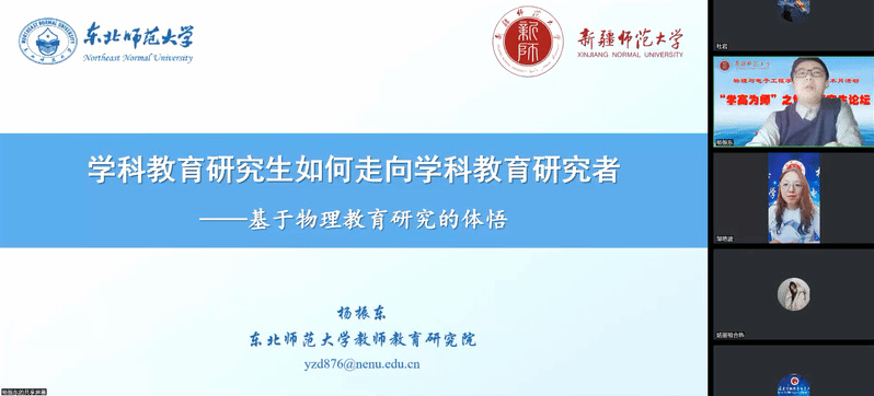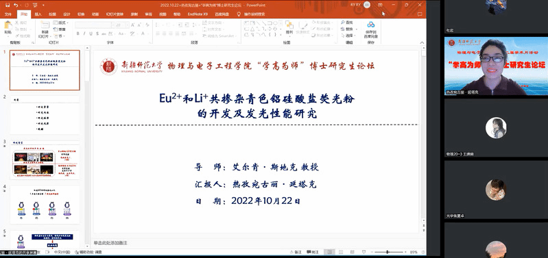 2022年10月22日下午16:00,今年会jinnianhui第二届学术月系列活动—“学高为师”之博士研究生论坛在线上举行。报告人分别是东北师范大学教师教育研究院博士研究生的杨振东,中国科学技术大学博士研究生的王晓宁、牛素俭、程静和今年会官方网站博士研究生的热孜宛古丽•延塔吉,5名在读博士。会议由我院实验室主任邹艳波老师主持,物电学院路俊哲教授、塔西买提·玉苏甫教授、戴鹏鹏教授和289名师生参会。