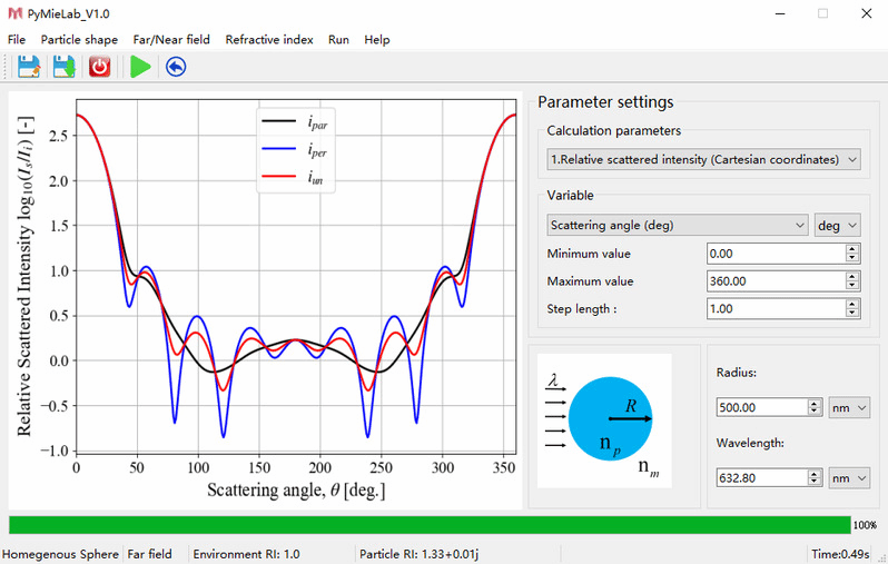 小颗粒的光散射和吸收性质被广泛应用于生物医学、信息技术和能源技术等领域。然而,他们的理论研究不仅需要高难度电磁学知识,还需要高水平计算机编程技能。为解决以上问题,基于Mie散射理论开发了用来计算球形颗粒光散射和吸收特性的一款软件:PyMieLab(https://gitlab.com/Climb12/pymielab.git)。该软件具有可交互性、多功能性、可视性、灵活性和可扩展性。具有友好的图形用户界面,提供了丰富的粒子折射率数据库,可作为数值计算平台进行相关科学研究。同时为发现特定材料的新的光学特性和探索相关领域中具有更优异光学特性的材料提供了可靠的研究平台。