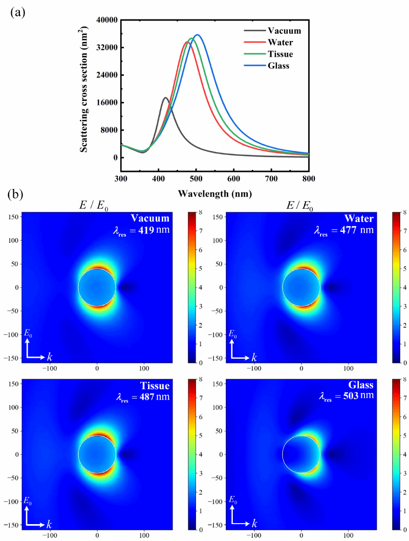 80nm金银合金纳米球在不同介质中的散射光谱及其对应共振波长处的表面增强效应