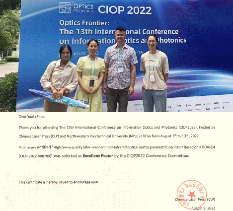 塔西买提·玉苏甫教授课题组参加第十三届国际信息光学与光子学学术会议,周玉霞同学荣获优秀墙报奖