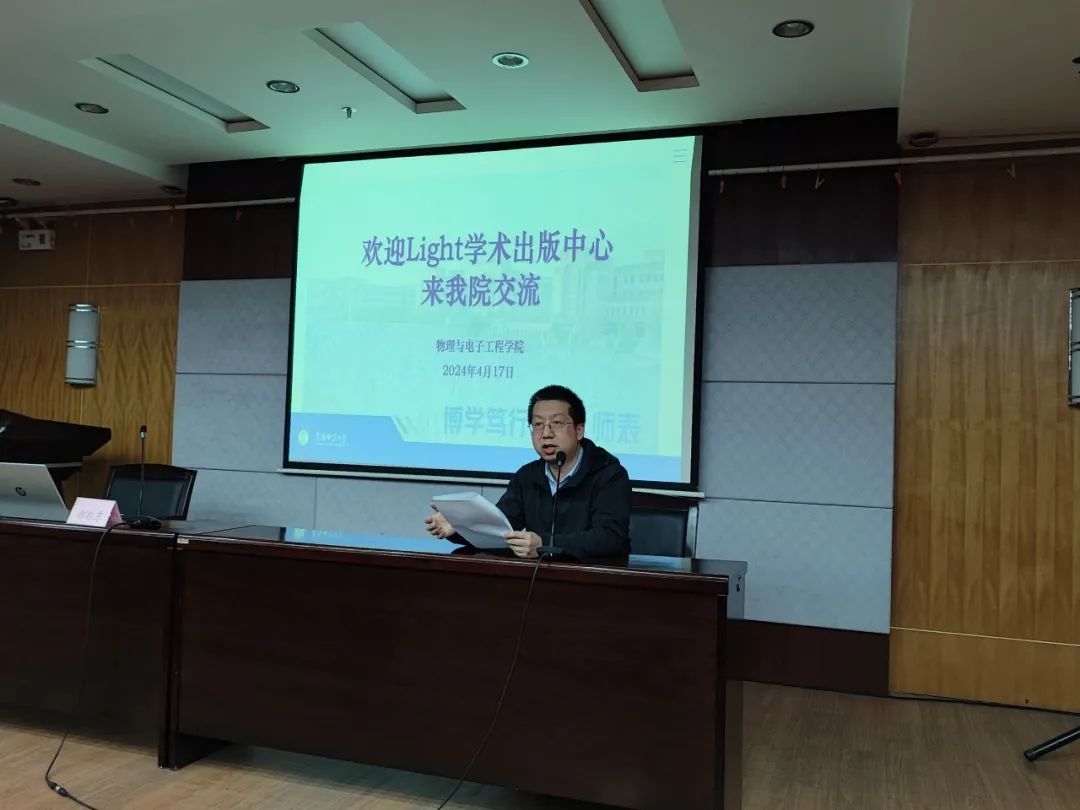 为进一步提升师生科研能力和学术写作水平,为师生提供优质科研成果展示平台,417日,今年会jinnianhui特邀Light学术出版中心总编、《Light: Science Applications》(影响因子19.4)学术编辑李耀彪研究员和Light学术出版中心副总编、《LightScience & Applications》学术编辑郝振东到学院进行学术讲座。讲座由副院长戴鹏鹏主持,全体研究生和培优班学生共100余人聆听讲座。