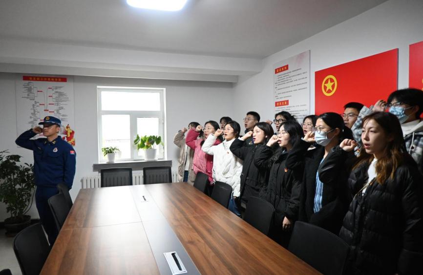活动伊始,在主持人王梓正同志的带领下,全体党员一起学习了习近平新时代中国特色社会主义思想和党的二十大精神、习近平总书记系列重要讲话和重要指示批示精神。随后,乌鲁木齐市沙依巴克区新医路消防救援站班长带领全体党员重温了入党誓词。随即,支部党员同志们一同随着乌鲁木齐市沙依巴克区新医路消防救援站班长参观了消防员学习和生活的地方,并学习了消防执勤车辆、消防器材的用途和使用方法,了解了消防救援站的光荣历史及近年来取得的各项荣誉。部分党员、学生代表还在消防员的专业指导下,通过试穿,试用零距离体验了消防、感受了消防。