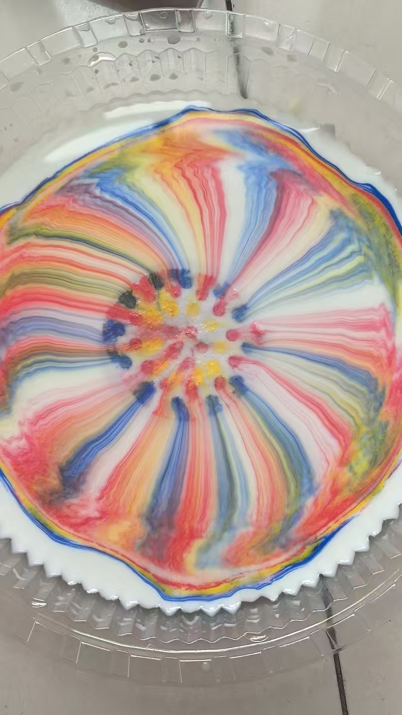 (一)水中烟花:洗洁精降低牛奶表面张力,使牛奶表面张力不均产生流动。洗洁精分子与牛奶中的脂肪、蛋白质等相互作用,打乱牛奶内部结构,引发牛奶运动。水彩笔颜料在牛奶流动带动下,向四周扩散,呈现烟花绽放状,而洗脸巾的毛细作用会辅助牛奶流动,增强这种效果。