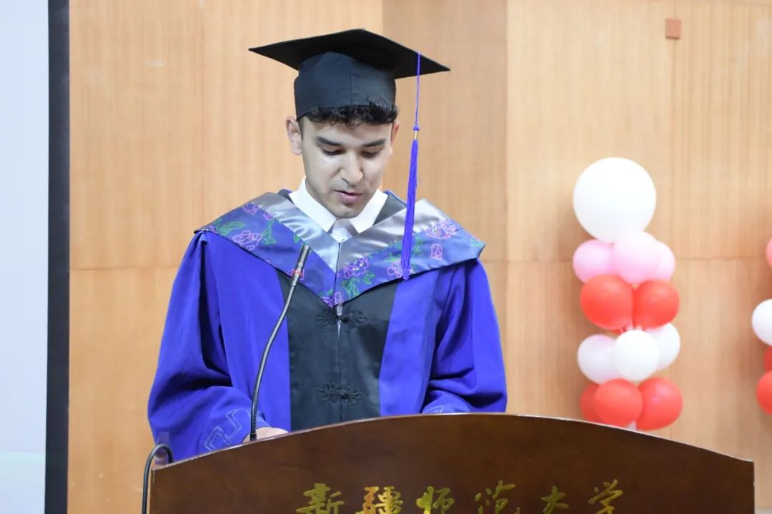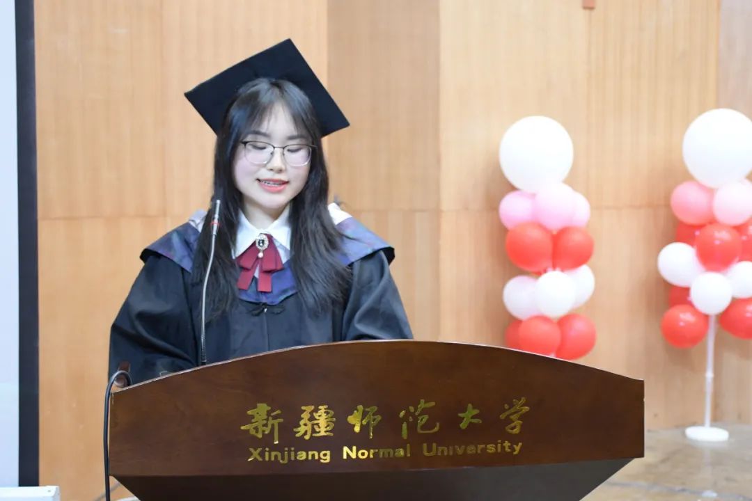拨穗仪式后,研究生代表哈力扎提·阿卜力米提,本科毕业生代表邓丽发言,他们回顾了在师大求学时光,感念了同窗之间的互帮互助,感谢了学院老师们培养教诲,表达了对母校的感激之情,寄托了对未来的美好憧憬。
