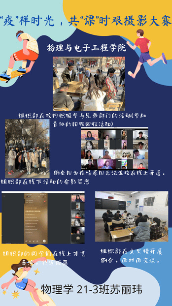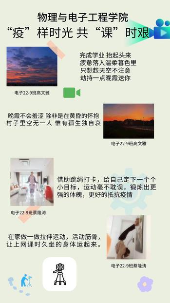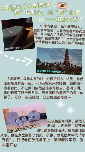 因为疫情,同学们又回到了线上课堂,现在居家上网课相对于之前坐在教室上课,同学们内心有着不一样的感受。为更好地发挥学院在心理健康教育工作中的主体作用,营造良好的校内心理健康教育活动氛围,切实落实2022年心育通知[2022]3号要求,根据心理健康服务中心2022年秋季学期活动安排,我院于10月26日-11月6日组织举办了“‘疫’样时光,共‘课’时艰”主题摄影大赛,以深化我院心理育人工作,将心理健康教育工作落实到“育人”上来,培养学生乐观向上、理性平和的心态。