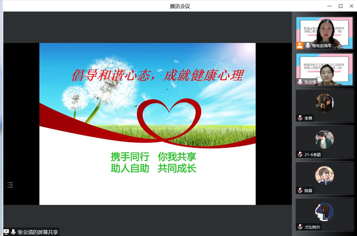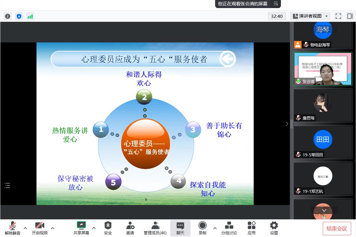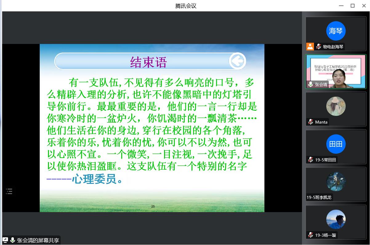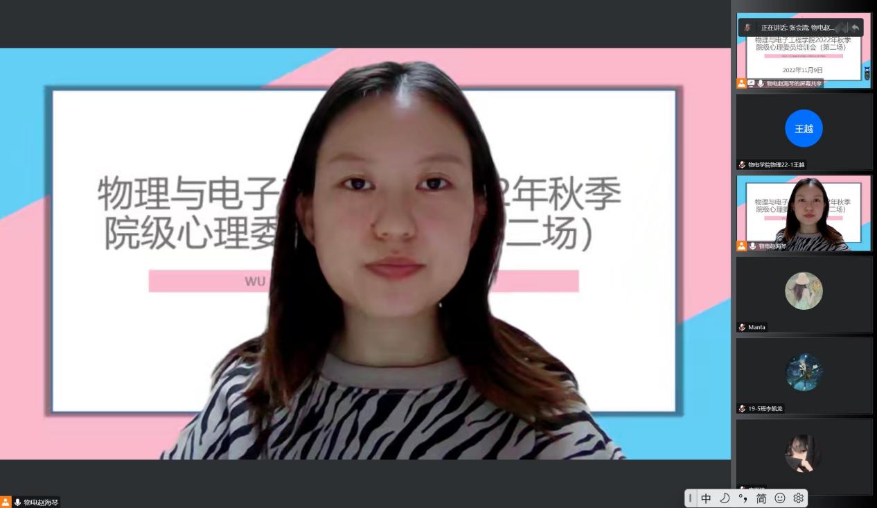 班级心理委员是学校心理健康教育工作的重要组成部分,在今年会心理健康教育工作中发挥着重要作用。为进一步提升我院心理委员在心理健康教育工作中的积极影响,我院于11月10日晚20:00在腾讯会议线上开展了第二场2022年秋季院级心理委员培训会。本次培训邀请到了我院物理20-3班张会清(原学生会心悦部负责人)作为主讲人做培训,学院全体心理委员参加。