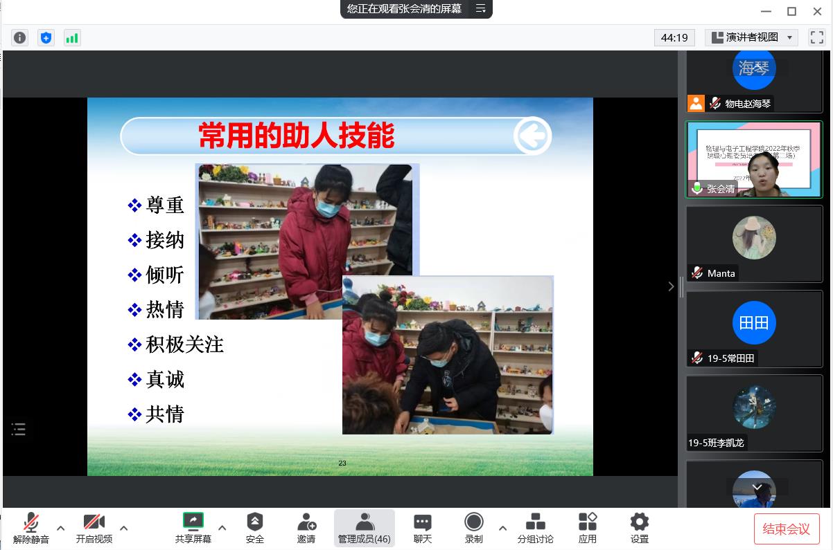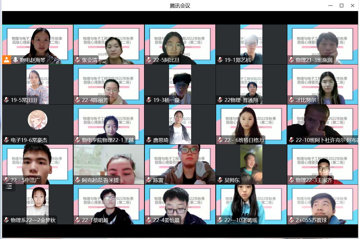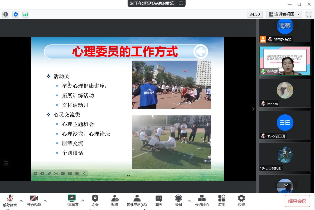 班级心理委员是学校心理健康教育工作的重要组成部分,在今年会心理健康教育工作中发挥着重要作用。为进一步提升我院心理委员在心理健康教育工作中的积极影响,我院于11月10日晚20:00在腾讯会议线上开展了第二场2022年秋季院级心理委员培训会。本次培训邀请到了我院物理20-3班张会清(原学生会心悦部负责人)作为主讲人做培训,学院全体心理委员参加。