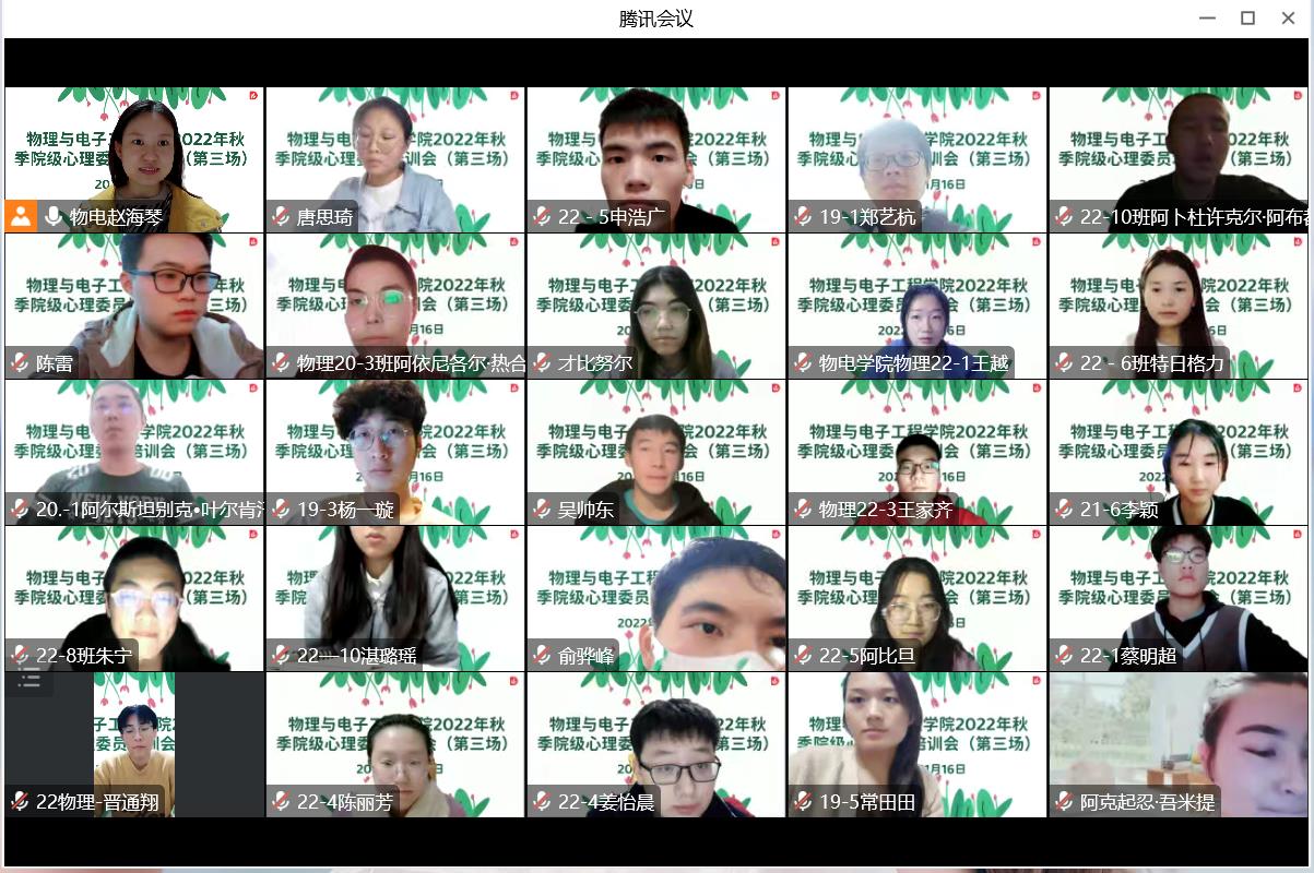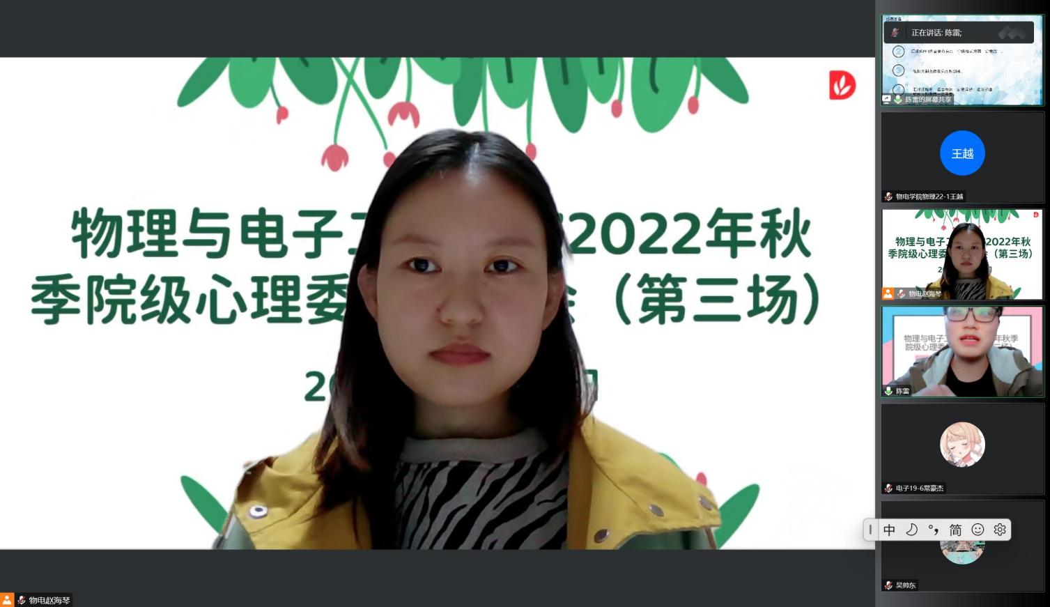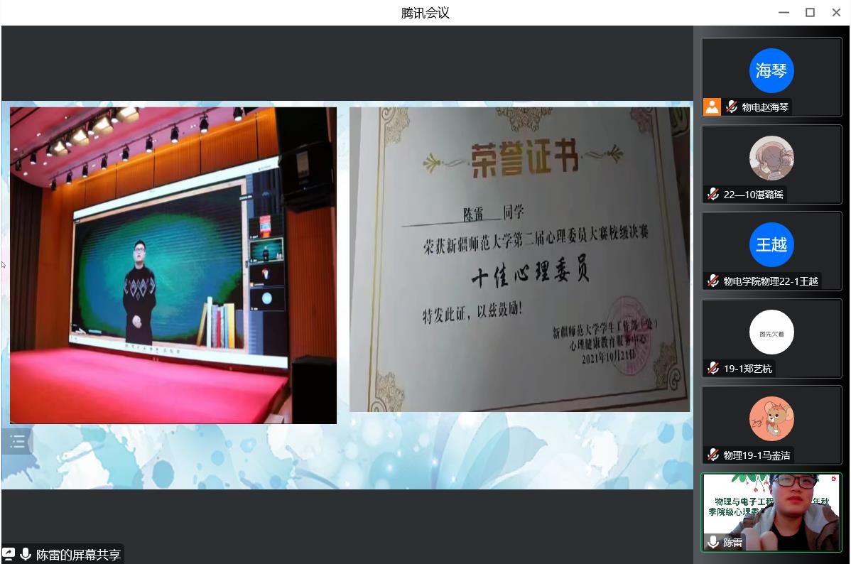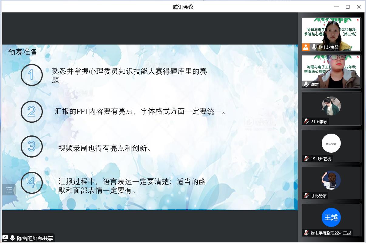 为进一步加强我院心理委员的角色意识,提升心理委员工作素养,培养心理委员自助、互助、助人的能力,我院于11月16日晚20:00在腾讯会议线上召开第三场2022年秋季院级心理委员培训会。本次培训邀请到了我院物理20-4班心理委员陈雷(今年会官方网站第二届心理委员技能大赛“十佳心理委员”)作为主讲人做培训,学院全体心理委员参加。