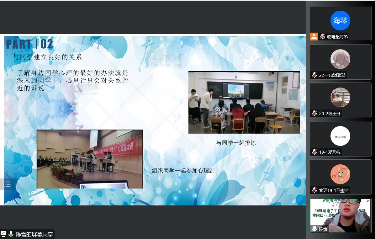 陈雷为大家带来了“心理委员技能大赛经验分享”为主题的培训,他为大家介绍了什么是心理委员工作、讲解了心理委员如何做好班级心理健康工作、分享了心理委员技能大赛经验。培训最后,特别是大一年级心理委员们就心理委员技能大赛与陈雷进行了互动和交流,为明年参加比赛积极做准备。