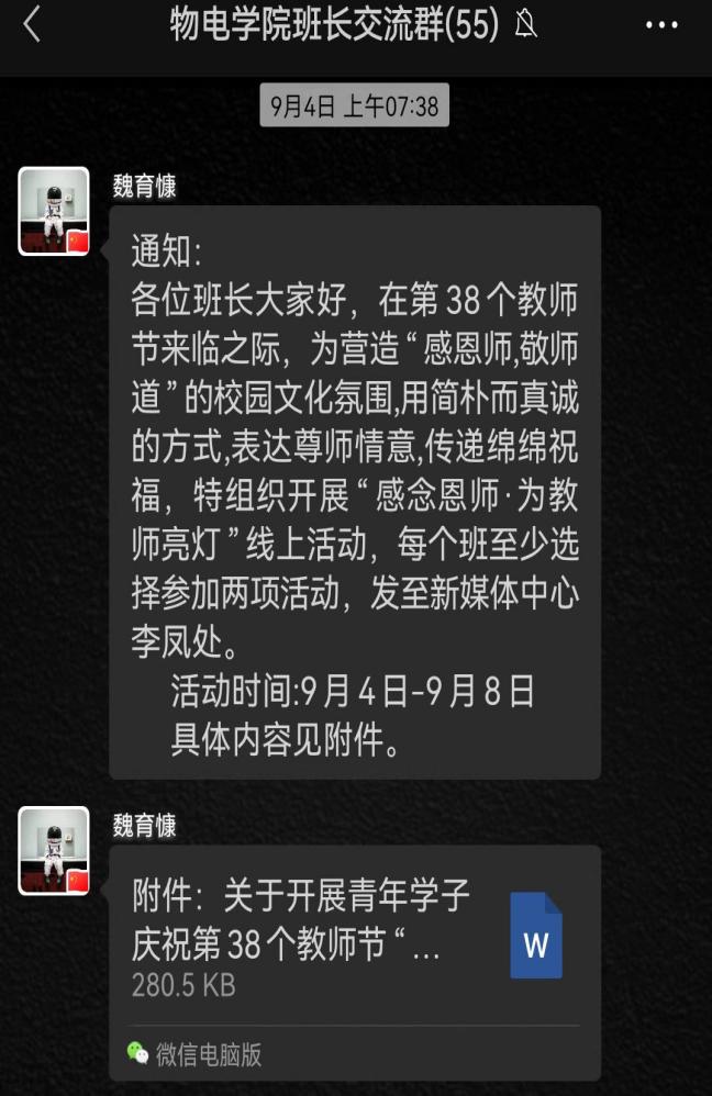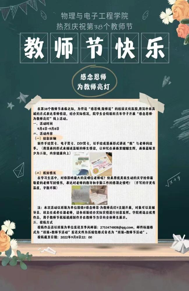 2022年9月10日是第38个教师节,在教师节来临之际,为营造“感恩师,敬师道”的校园文化氛围,今年会jinnianhui分团委学生会于2022年9月4日至9月10日组织全院学生开展了“感念恩师·为教师亮灯”活动。
