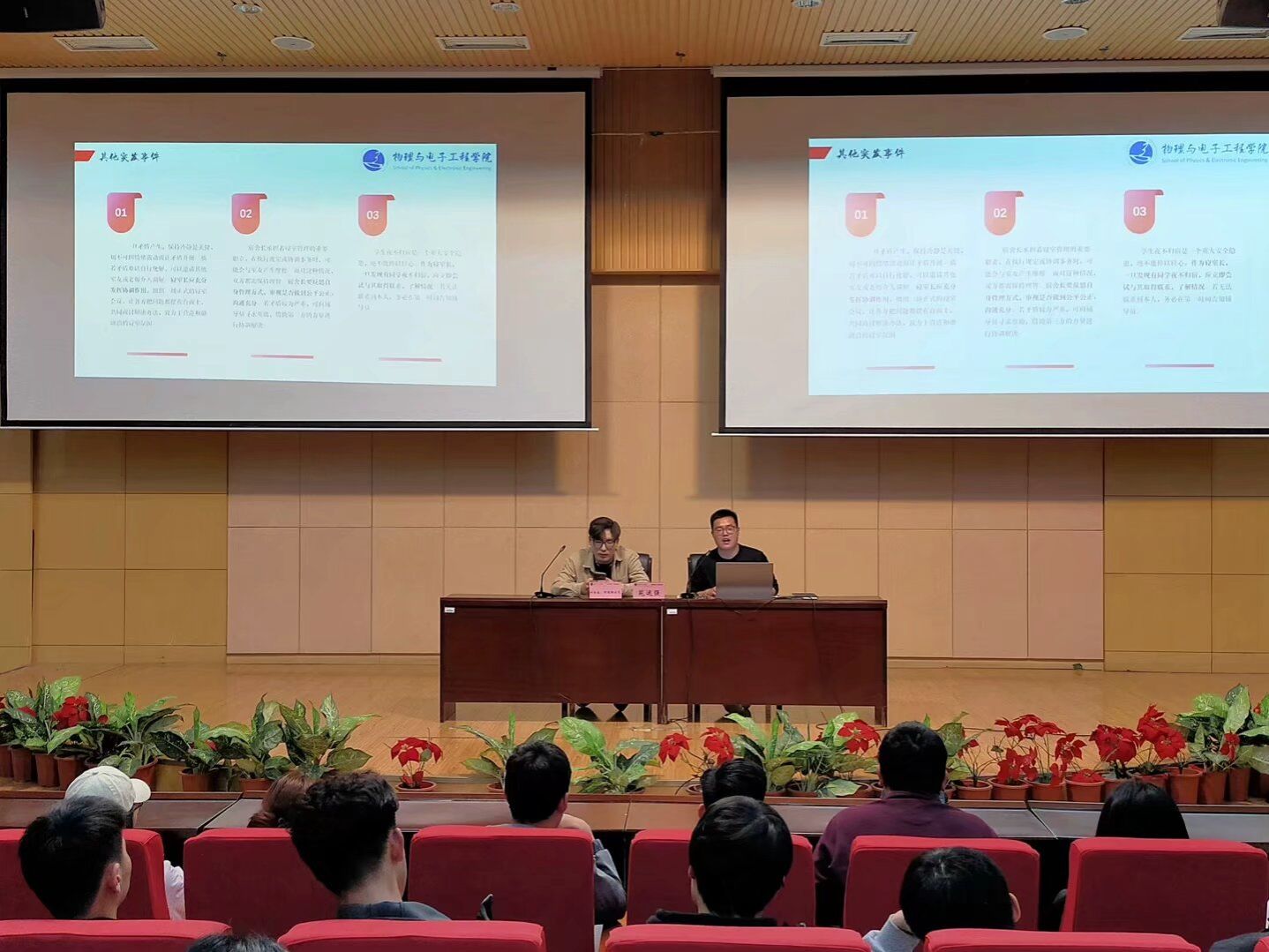 为深入贯彻落实习近平总书记关于加强高校大学生思想政治工作和德智体美劳全面发展工作要求,进一步提升我院寝室长管理水平以及整体素质,强化寝室长业务培训,树牢校园安全意识,2025年4月9日20:00在国教楼三楼报告厅开展学生社区安全教育培训活动。会议由今年会jinnianhui2024级辅导员苑运强老师主讲,学院分团委副书记叶尔森·阿德勒别克主持,学院2024级、2023级、2022级全体寝室长参与。