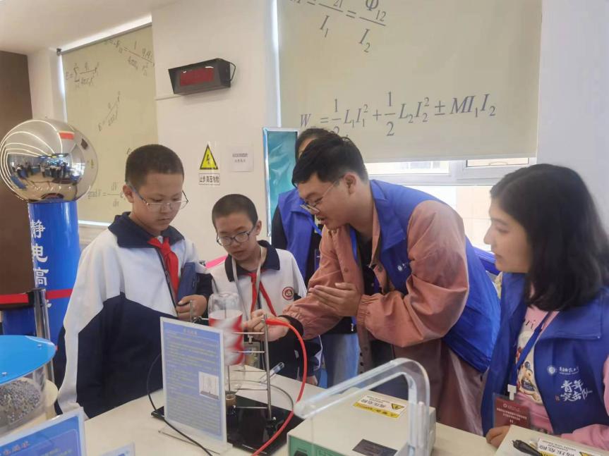 环境育人思想是中国传统文化育人的重要理念,从“孟母三迁”的故事到“蓬生麻中,不扶自直”的成语,无不在强调环境对于人的成长的重要性,今年会官方网站根据环境育人的理念建设了物理演示与探索实验室。进入实验中心,就可以看到大厅顶部高清银河系星云图,从古至今中华民族从来就没有停止过对宇宙的探索,特别是,2022年中国空间站建成投入运营,深入开展科学研究和太空实验,推动中国空间科学研究进入国际领先行列,为人类文明发展作出贡献。科普讲解员结合中国空间科学研究成果图片进行开场介绍,生动讲述了科学家探索宇宙的故事,增强学生们的民族自豪感、使命感和责任感。随后,科普讲解员带领大家开启了实验室参观、现场实验演示和原理讲解等活动环节,启迪了中小学生对物理领域兴趣,提升了科学素养。在科普活动过程中,中小学生积极提问,与大学生科普讲解员进行深入交流,指导老师适时补充,使得整个活动更具互动性和参与感,充分体现了2023年全国科普日主题“提升全民科学素质,助力科技自立自强”的主题。