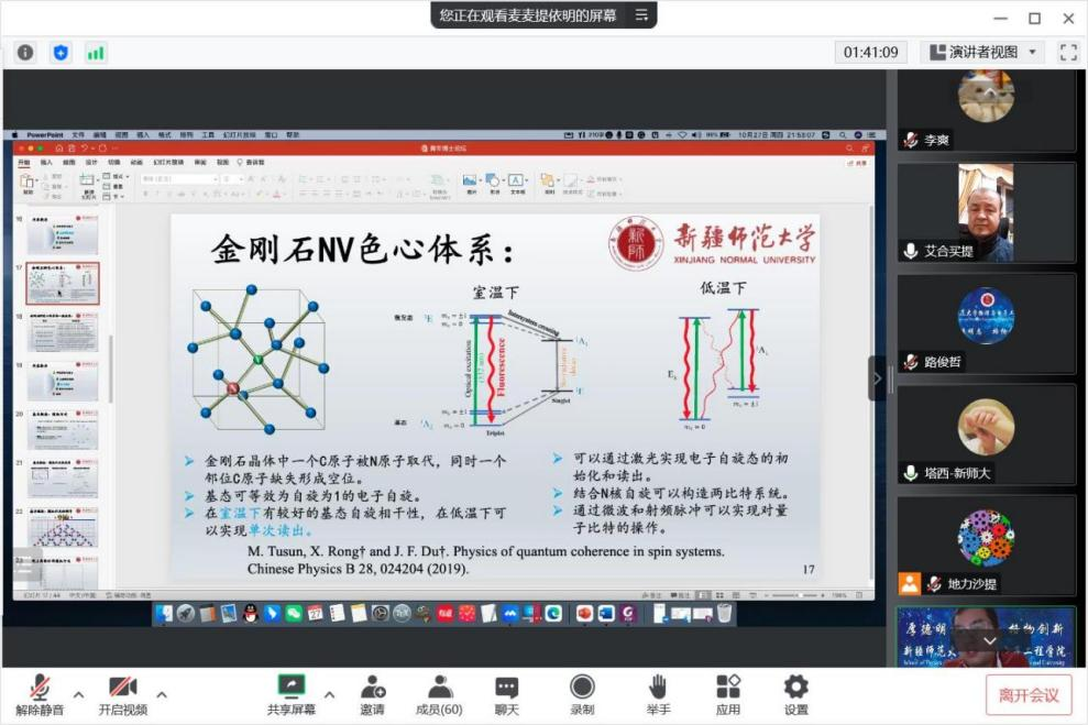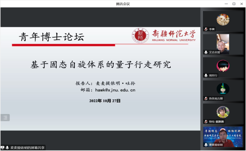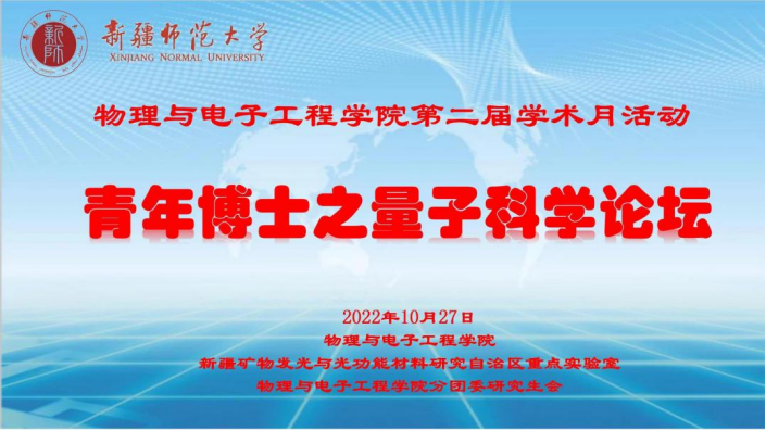 2022年10月27日下午20:30,今年会jinnianhui第二届学术月系列活动—青年博士之“量子科学”论坛在线上举行。会议由赴对口支援学校中国科学技术大学攻读博士的在职教师周世行和麦麦提依明·吐孙分享研究成果。艾合买提·阿不力孜教授主持会议,我院共67名教师、研究生参会。