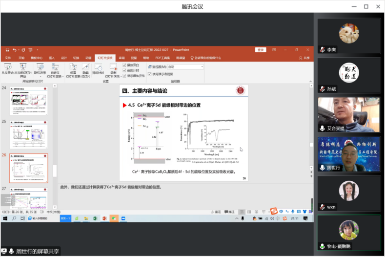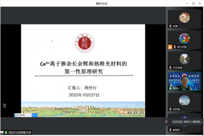 周世行老师以“Ce3+掺杂长余辉和热释光材料的第一性原理研究”为主题,以Ce3+掺杂的CaB2O4为研究对象,采用第一性原理计算方法,对基质材料、发光中心、陷阱中心等进行计算和分析,从理论计算的角度对长余辉和热释光材料的发光性质和机理进行阐释,为进一步研制高性能长余辉材料提供启示和借鉴。同时对老师、学生提出的长余辉发光材料的发光中心的光跃计算过程、处理材料时计算和实验的区别等问题进行讨论与讲解。