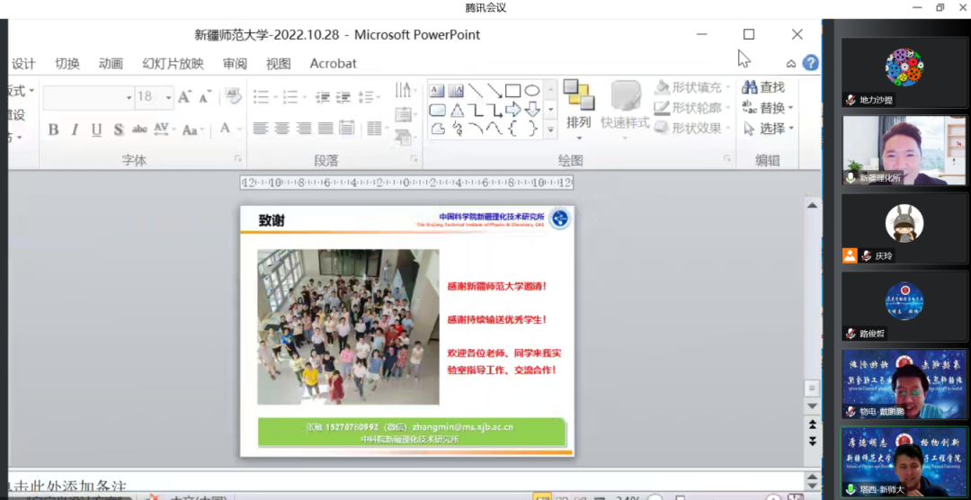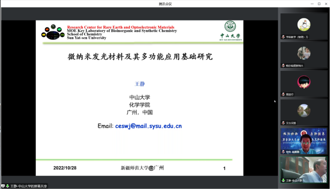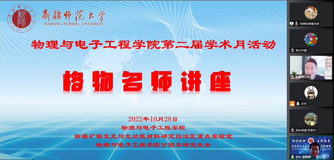 2022年10月28日下午16:30,今年会jinnianhui第二届学术月系列活动—格物名师讲座在线上举行。会议特别邀请中国科学院新疆理化技术研究所研究员张敏(国家优青)和中山大学王静教授,由学院副院长戴鹏鹏教授主持。我院教师、研究生共计100余人参会。