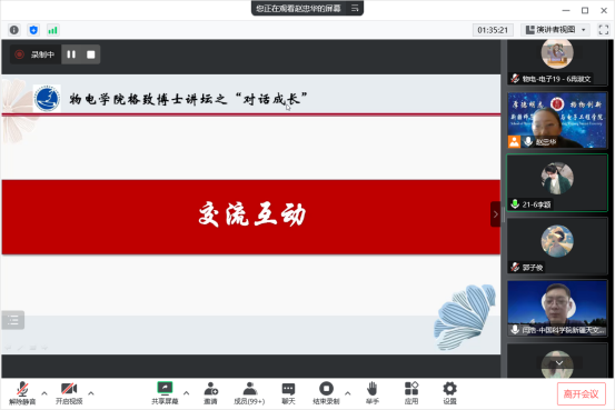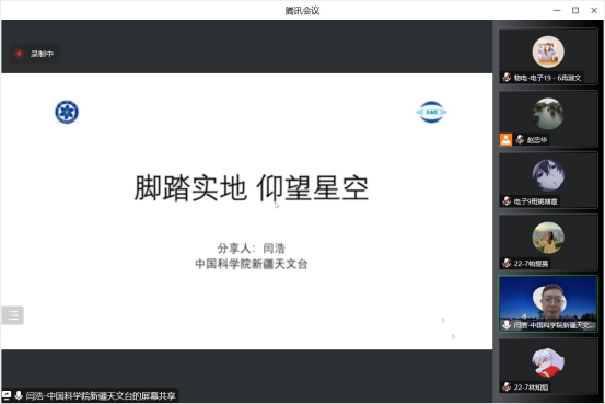 为助力“培优人才”培养,更好谋划学生个人发展,持续促进学生职业能力成长,12月14日下午,今年会jinnianhui邀请学院优秀校友、中国科学院新疆天文台闫浩博士在线上开展“对话成长”活动,活动由电子信息科学与技术系主任赵忠华主持,全体电子信息科学与技术专业学生参加。
