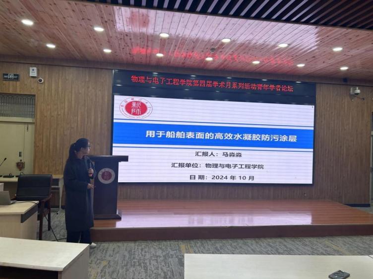 马淼淼作了题为“用于船舶表面的高效防污水凝胶涂层”的报告。她首先强调了海洋污损对船舶运行效率、能源消耗以及海洋生态环境造成的严重影响。接着详细阐述了所研究的防污水凝胶涂层的制备工艺,分享了所制备水凝胶涂层的测试数据与效果评估,证实了该涂层具有良好的机械强度和耐磨损性,能够适应船舶在航行过程中的各种机械应力。