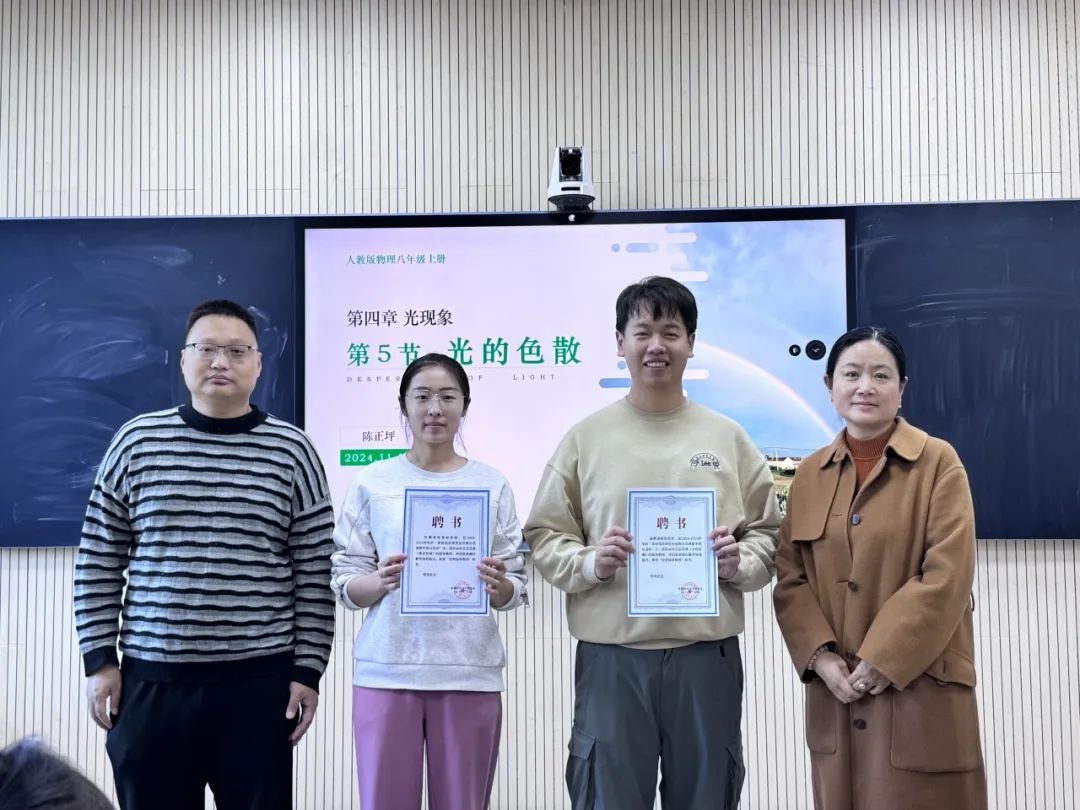 课堂展示结束后,物理系教研室主任赵方和张艳燕副教授一同为候孝聪和陈正坪同学的指导老师陈雪娇老师与裴阳老师颁发了聘书。